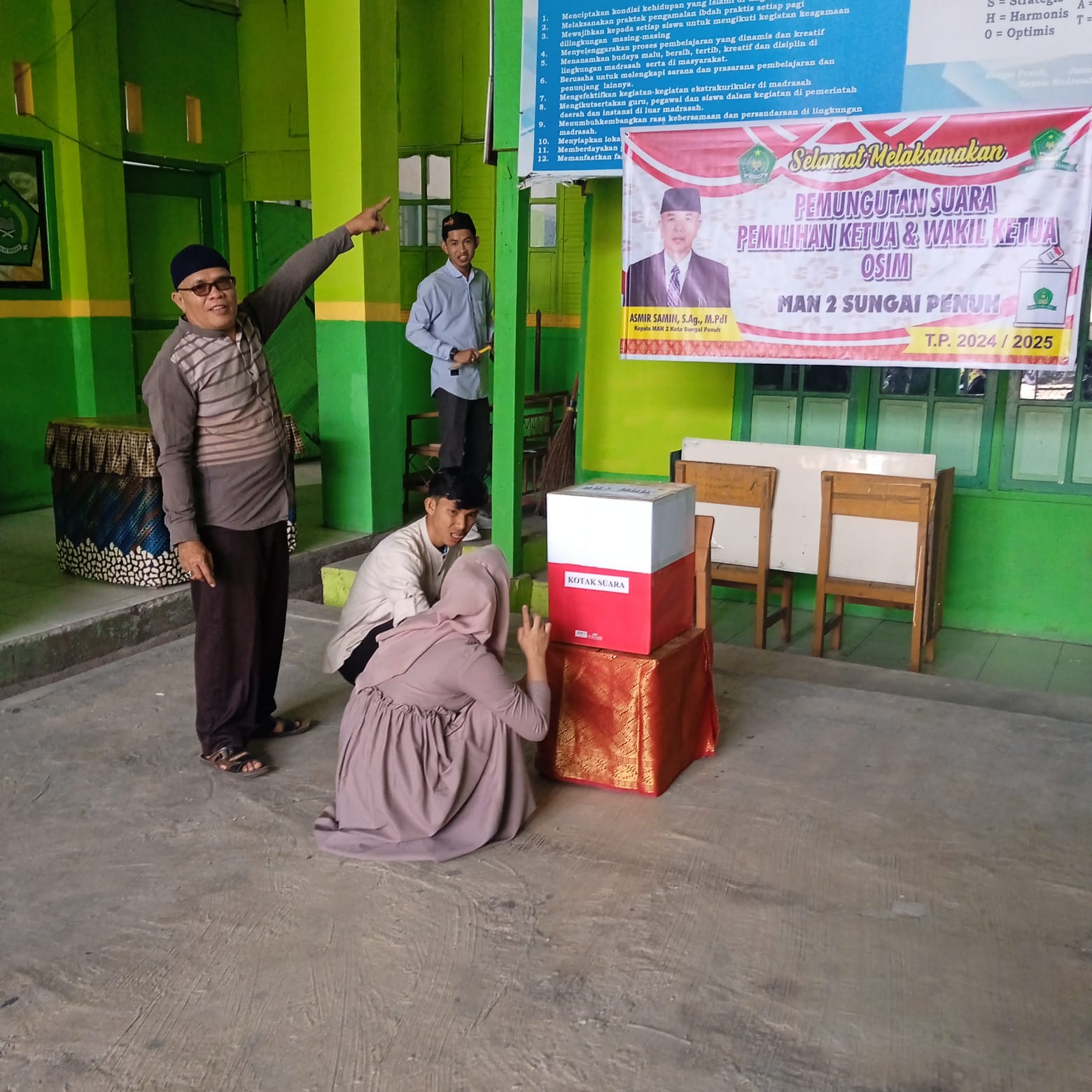 MAN 2 Sungai Penuh, 09 September 2024. Kegiatan pemilihan Ketua dan Wakil Ketua OSIM adalah kegiatan tahunan yang selalu diselenggarakan oleh MAN 2 Sungai Penuh guna pembaruan dan peningkatan kegiatan di OSIM MAN 2 Sungai Penuh. Seperti di ketahui OSIM merupakan organisasi yang menjadi panutan bagi siswa-siswi di madrasah Setiap harinya mulai dari tempat untuk melaksanakan kegiatan dan sebagai wadah bagi Siswa - Siswi belajar dan mengembangkan kreatifitas.